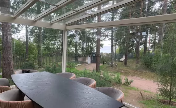 В Московской области, Рузский район, посёлок Большие Вязёмы, выполнено тёплое остекление солнечной комнаты современного дома с панорамными поворотно-откидными окнами из алюминиевого профиля Reynaers и тройным стеклопакетом. Комната ориентирована на живописный вид на лес и озеро. Монтаж включал герметизацию и установку всех конструкций с фурнитурой Reynaers CP 155. Общая стоимость проекта с учётом скидки 7% составила 483 600 рублей.