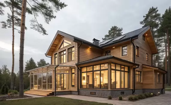 Выполнено аккуратное и функциональное остекление крыльца с использованием холодного алюминиевого профиля. Конструкция идеально сочетается с архитектурой дома из клееного бруса. Остекление защищает от снега, ветра и дождя, а также визуально делает крыльцо частью дома, не утяжеляя фасад. Установлены прозрачные закалённые стекла, профиль — классика от Provedal.