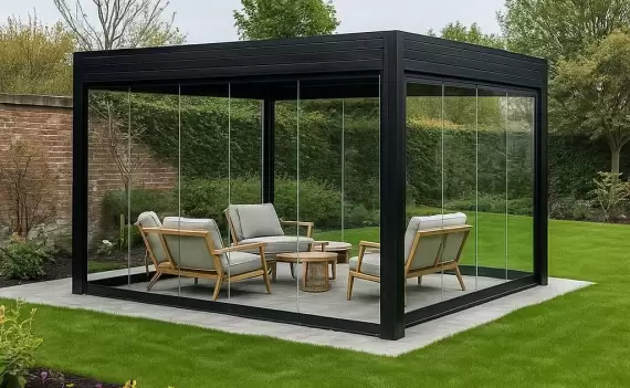 Нами была выполнена работа по остеклению современной беседки с алюминиевым каркасом в частном доме. Особенность проекта — минималистичный чёрный каркас и максимальная открытость пространства за счёт полного безрамного остекления. Использована раздвижная система с тонкими направляющими, которые не нарушают геометрию конструкции. Заказчику было важно сохранить эстетику лофта и при этом получить защиту от ветра и дождя — чего мы добились без применения дополнительных стоек или перемычек.