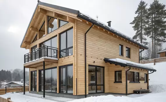В загородном доме из клеёного бруса установлены пластиковые окна VEKA Softline 82 с ламинацией «тёмный дуб». Смонтированы панорамные окна во второй свет, террасные и балконные двери, а также глухие и поворотно-откидные конструкции. Все швы герметизированы, окна установлены по ГОСТ. Срок выполнения работ — 8 дней.
