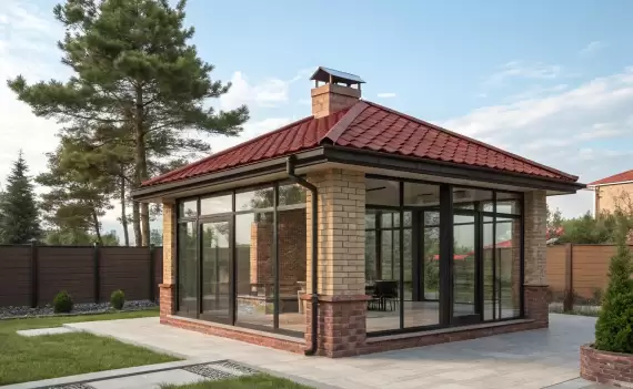 В кирпичной беседке с камином выполнено полутёплое панорамное остекление: алюминиевые профили с раздвижными системами и глухими вставками. Установлены усиленные стеклопакеты, что обеспечивает хорошую шумоизоляцию и комфорт в межсезонье. Идеально для загородных посиделок в любую погоду с весны до поздней осени.